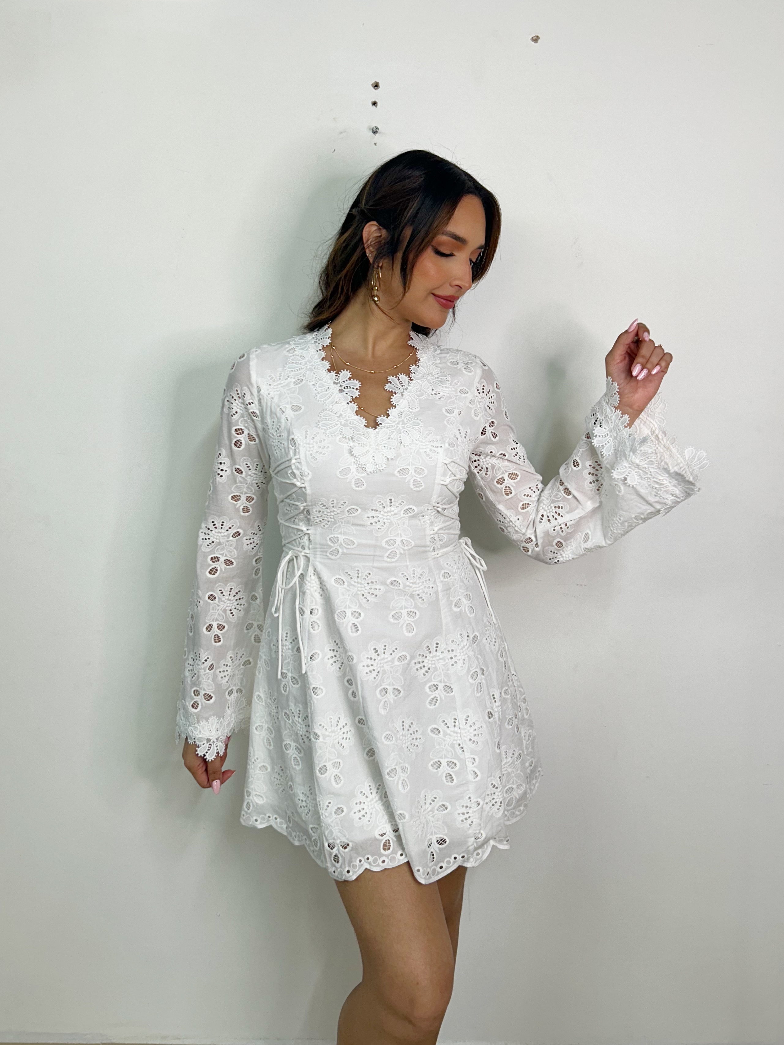 LACE TRIM EYELET MINI DRESS
