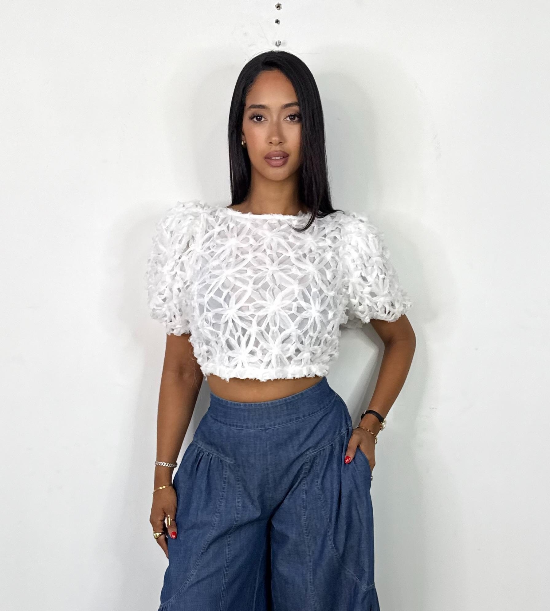 White Flower Lace White Crop Top
